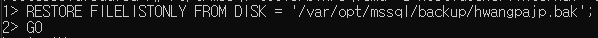 RESTORE FILELISTONLY FROM DISK = '/var/opt/mssql/backup/hwangpajp.bak';